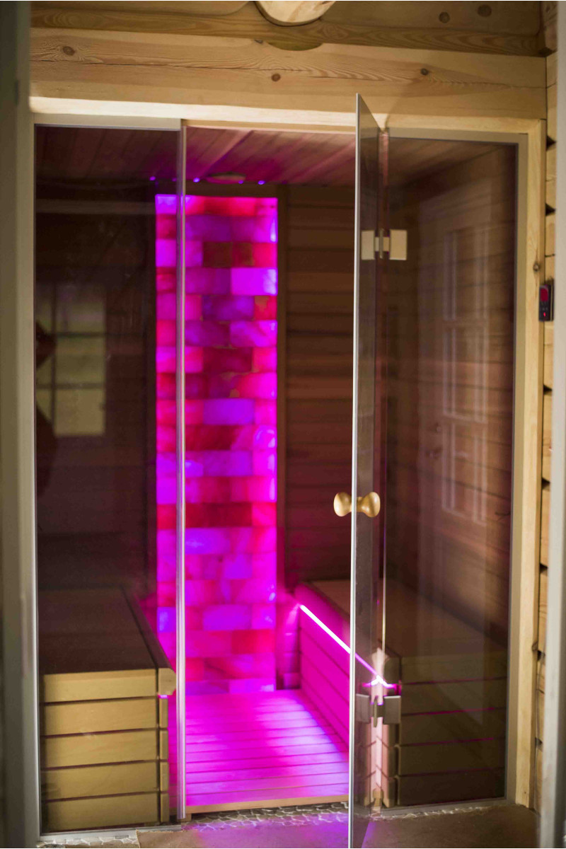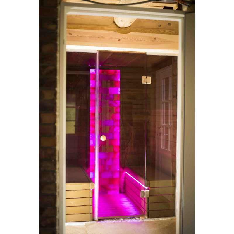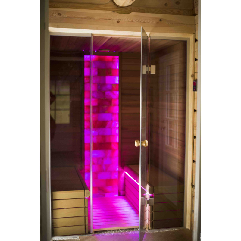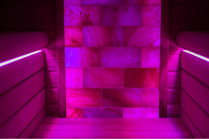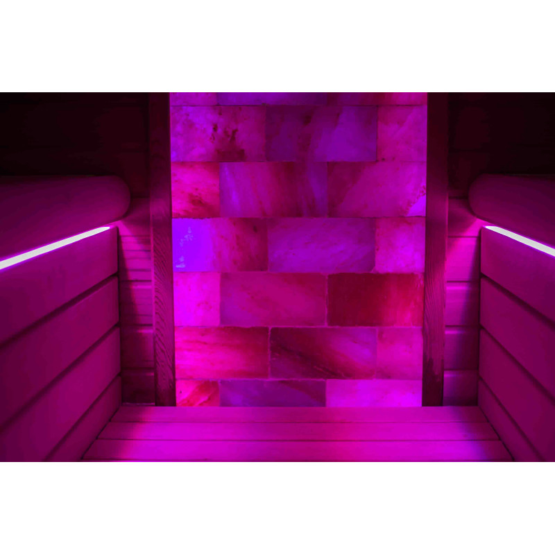 Ściana z cegły solnej himalajskiej wybrana do dekoracji sauny z wbudowanym kolorowym oświetleniem RGB, sterowana bezprzewodową zmieniarką kolorów, tworzy przytulne otoczenie i dodatkowo wzmacnia efekt sauny.