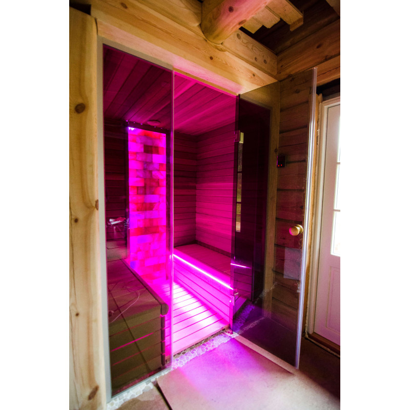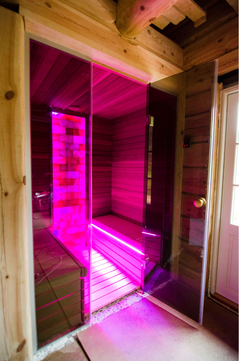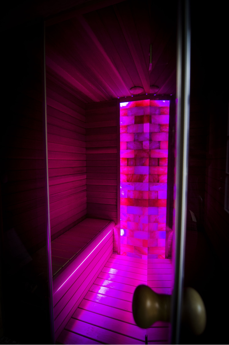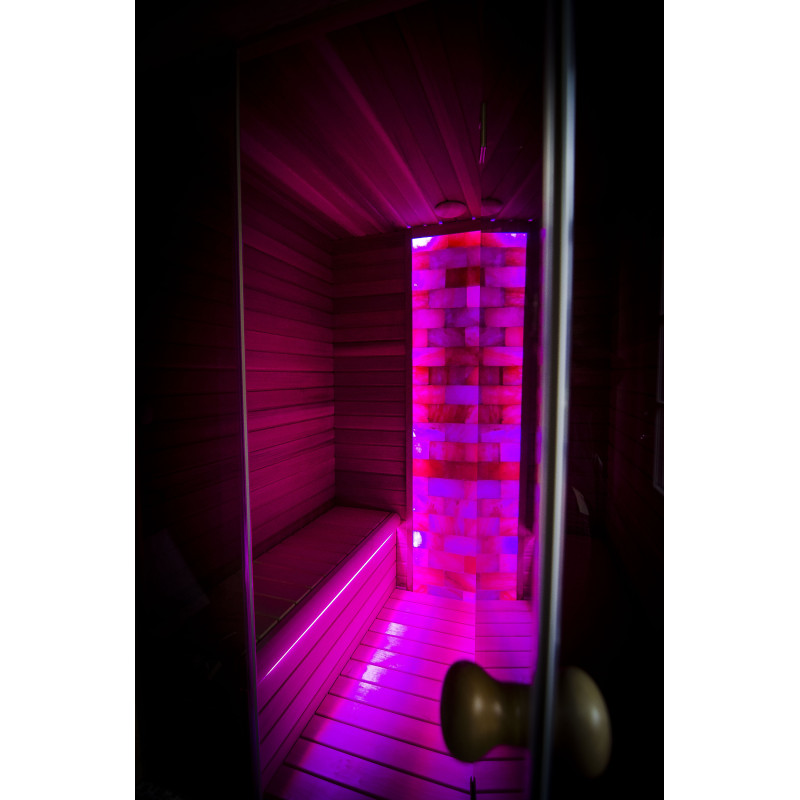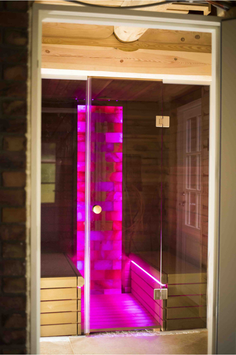 Ściana z cegły solnej himalajskiej wybrana do dekoracji sauny z wbudowanym kolorowym oświetleniem RGB, sterowana bezprzewodową zmieniarką kolorów, tworzy przytulne otoczenie i dodatkowo wzmacnia efekt sauny.